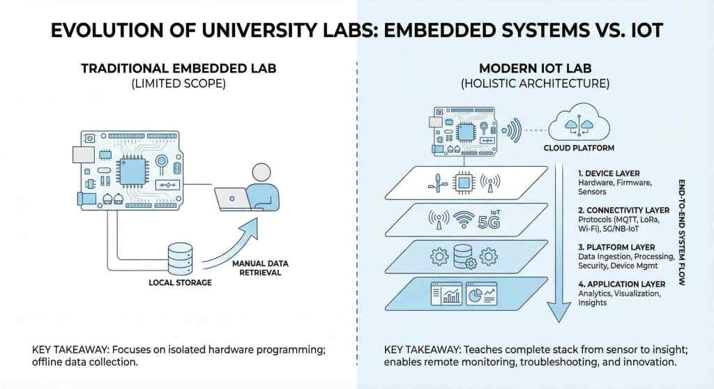 Most universities already have something they proudly call an IoT lab. Rows of ESP32 boards. Arduino kits. LEDs are blinking happily. LCD screens displaying temperature values. Students smile because something lights up.